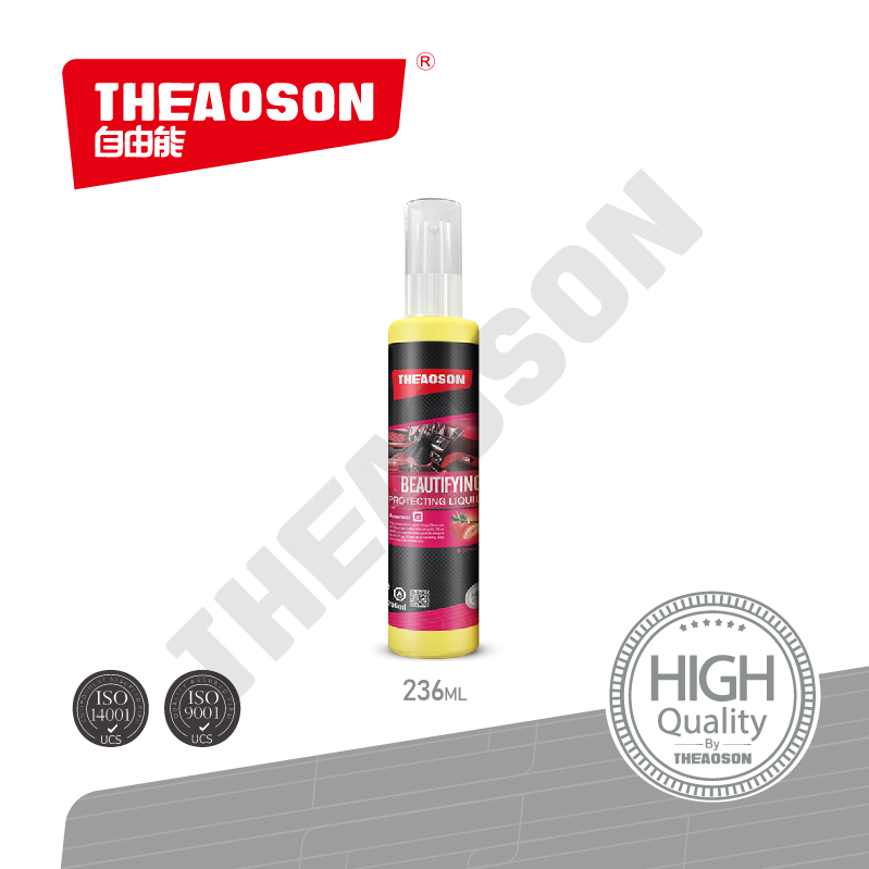 Beautifying protecting liquid is a quick polish agent with a multi-functional, immediately after resumption of a vehicle's inter plastic, rubber, leather and other materials, the surface of the original natural color, while high-purity natural spices to keep the car interior can be long-lasting fresh and aromatic, characteristic of clean components to quickly remove dust and dirt, while leaving a layer of sight with a durable anti-static protective film function, can effectively protect the leather, plastic and rubber products from ultraviolet rays, heat, ozone impact,; to prevent the instrument panel, leather products, tires and bumper fading, aging, cracking, wrinkling, etc; additional luster to beautify and restore the natural color; unique electrostatic protection to reduce dust build-up.